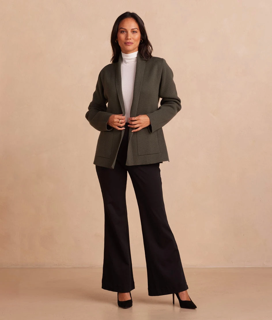 Polished enough for the office, perfect for parties, & just as comfortable as your favorite leggings. With a high waist and flattering flared legs, this statement-making pant is ready for whatever the day brings. And the icing on the cake? They’re made with an ultra-comfy blend of sustainable & recycled materials.