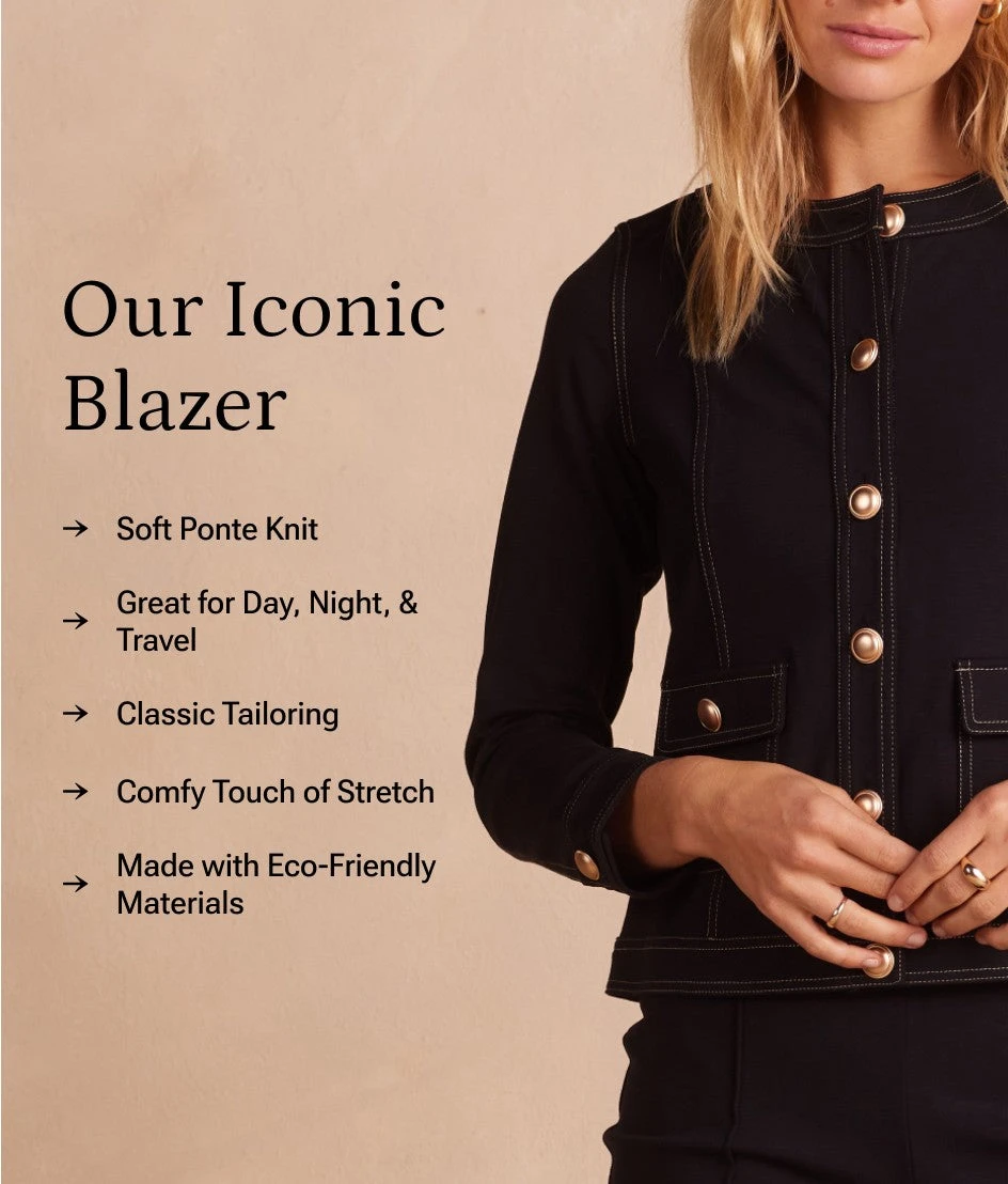 Iconic style in comfy, polished ponte knit. This update to the classic jacket is a day-to-night fave with sleek tailoring, lustrous buttons, & functional front pockets.