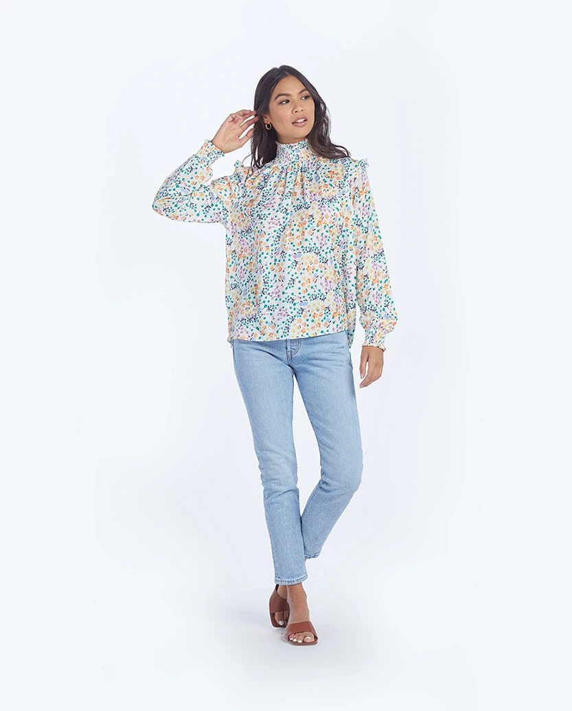 Treat yourself to some fresh flowers! The Silky Mock Neck Blouse in our bright watercolor floral print is a spring must-have. Crafted in super soft and silky recycled charmeuse, this mock neck blouse features chic smocking at the collar and cuffs. A tiny ruffle detail adds a romantic accent to the shoulders, collar, and cuffs. It’s a go-to match for your favorite Summersalt pants, and we love the look tucked in with our Paper Bag Ankle Pant!