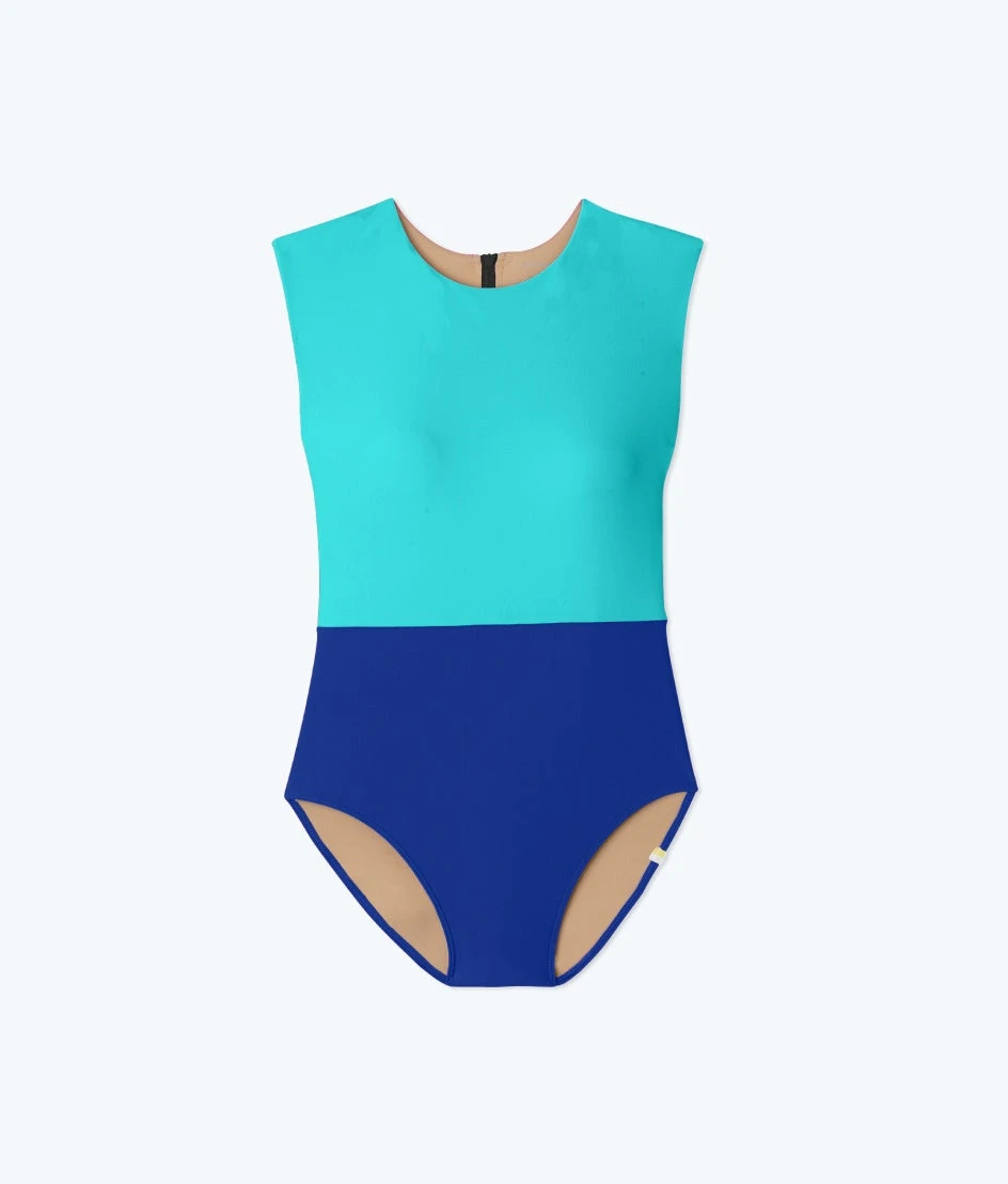 High-neck meets high fashion in this full-coverage, colorblocked beauty.