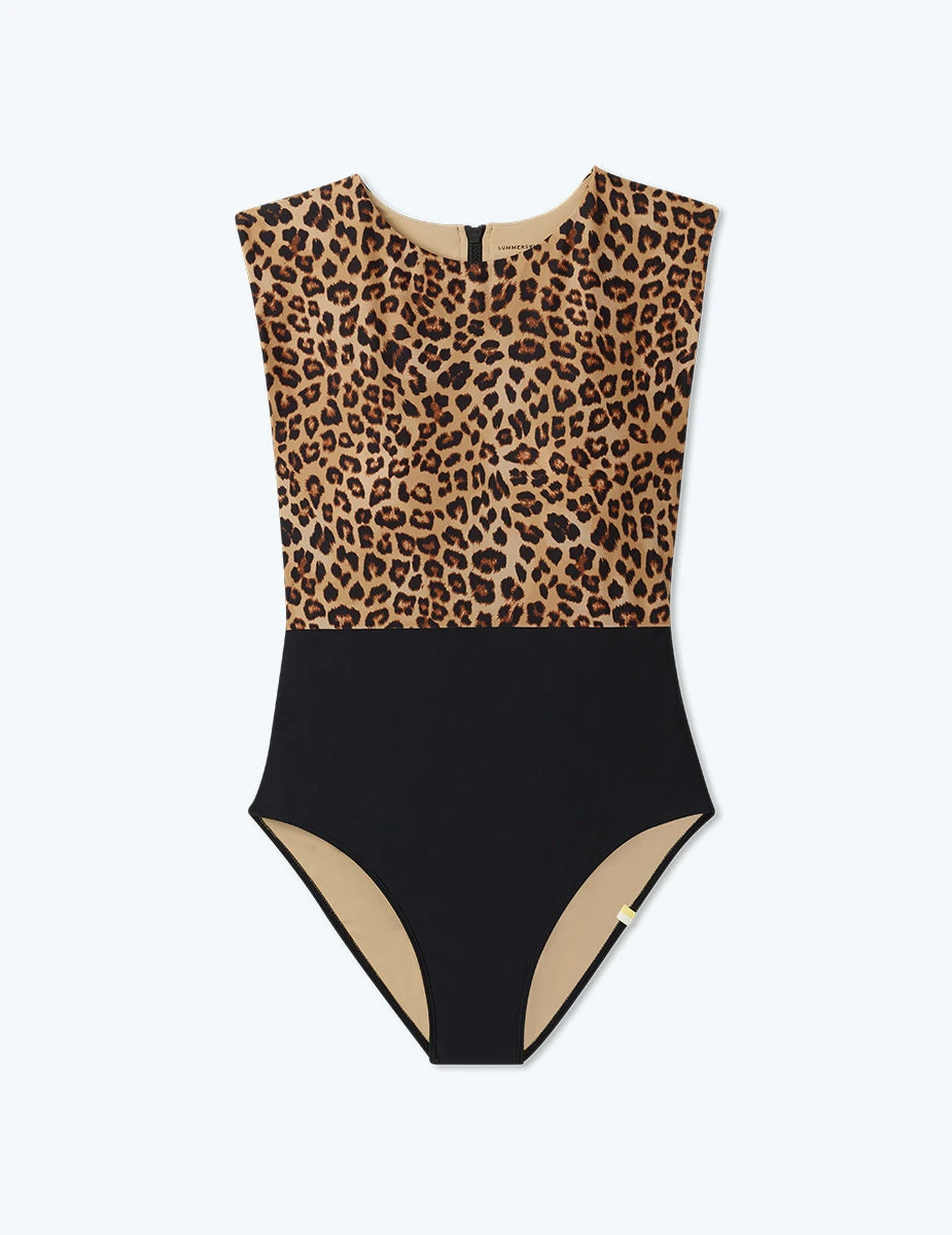High-neck meets high fashion in this full-coverage, colorblocked beauty.
